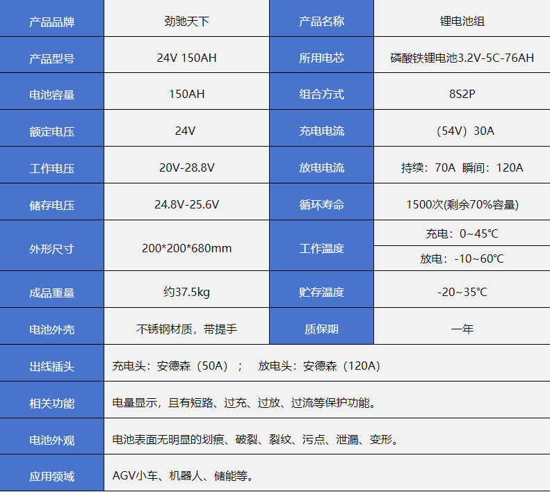| 电池容量 | 150AH | 组合方式 | 8S2P |